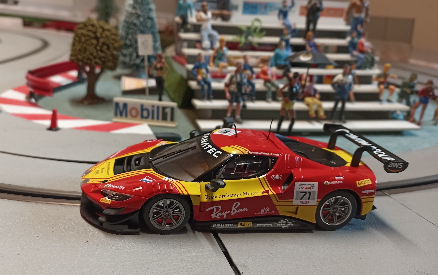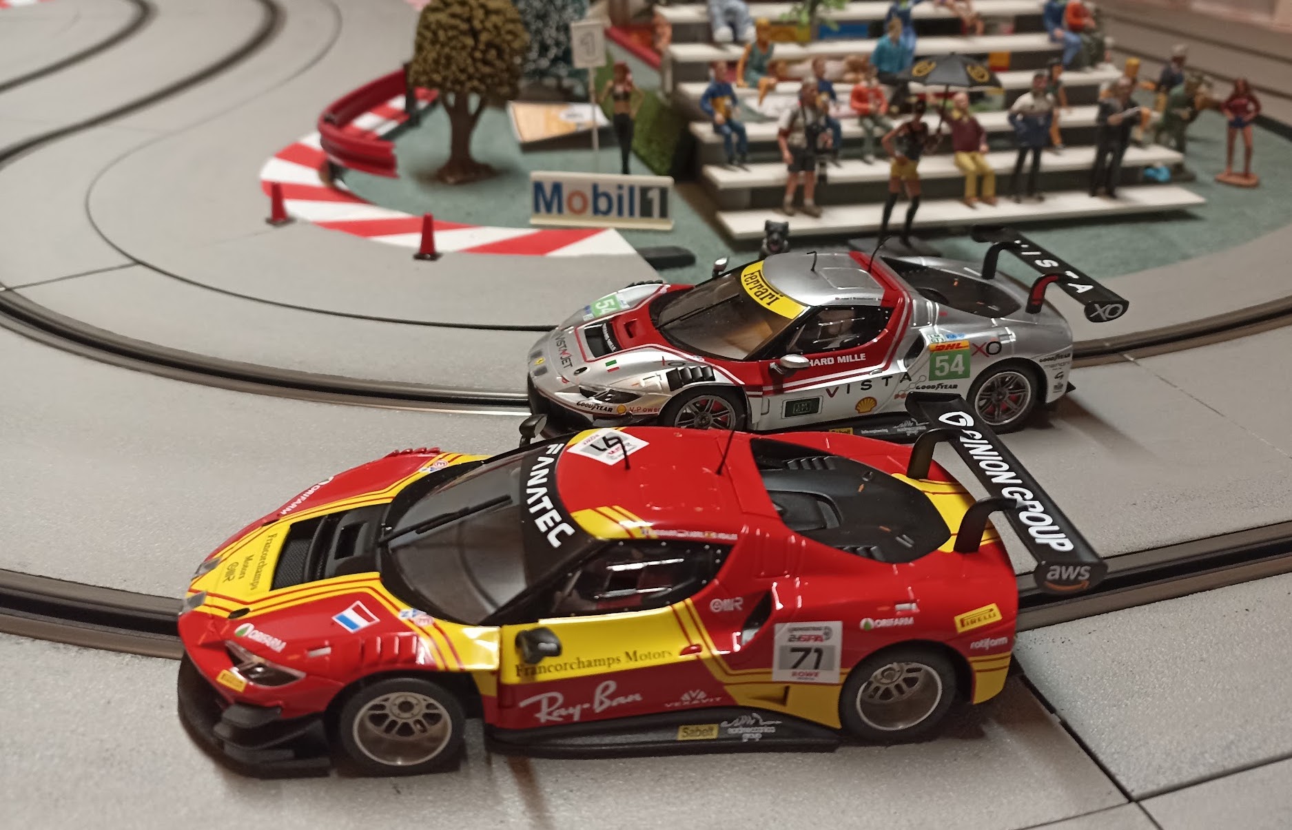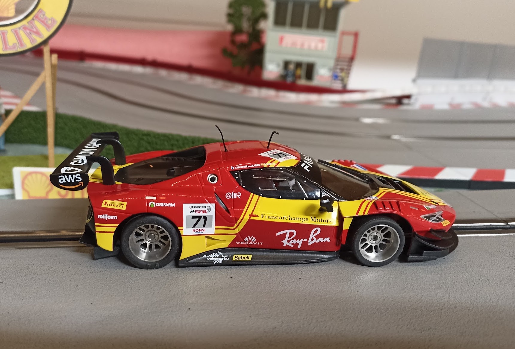 J’ai d’abord acheté ce modèle gris qui était moins commun que les versions rouge et jaune de Spa. Il est superbe mais j’avais oublié que ma piste est peinte en grise et que du coup les voitures grises sont moins visibles … je suis un peu con mais je me soigne et du coup j’ai peint la piste en noir … non je rigole, du coup j’ai aussi acheté plus tard une version rouge et jaune 😄