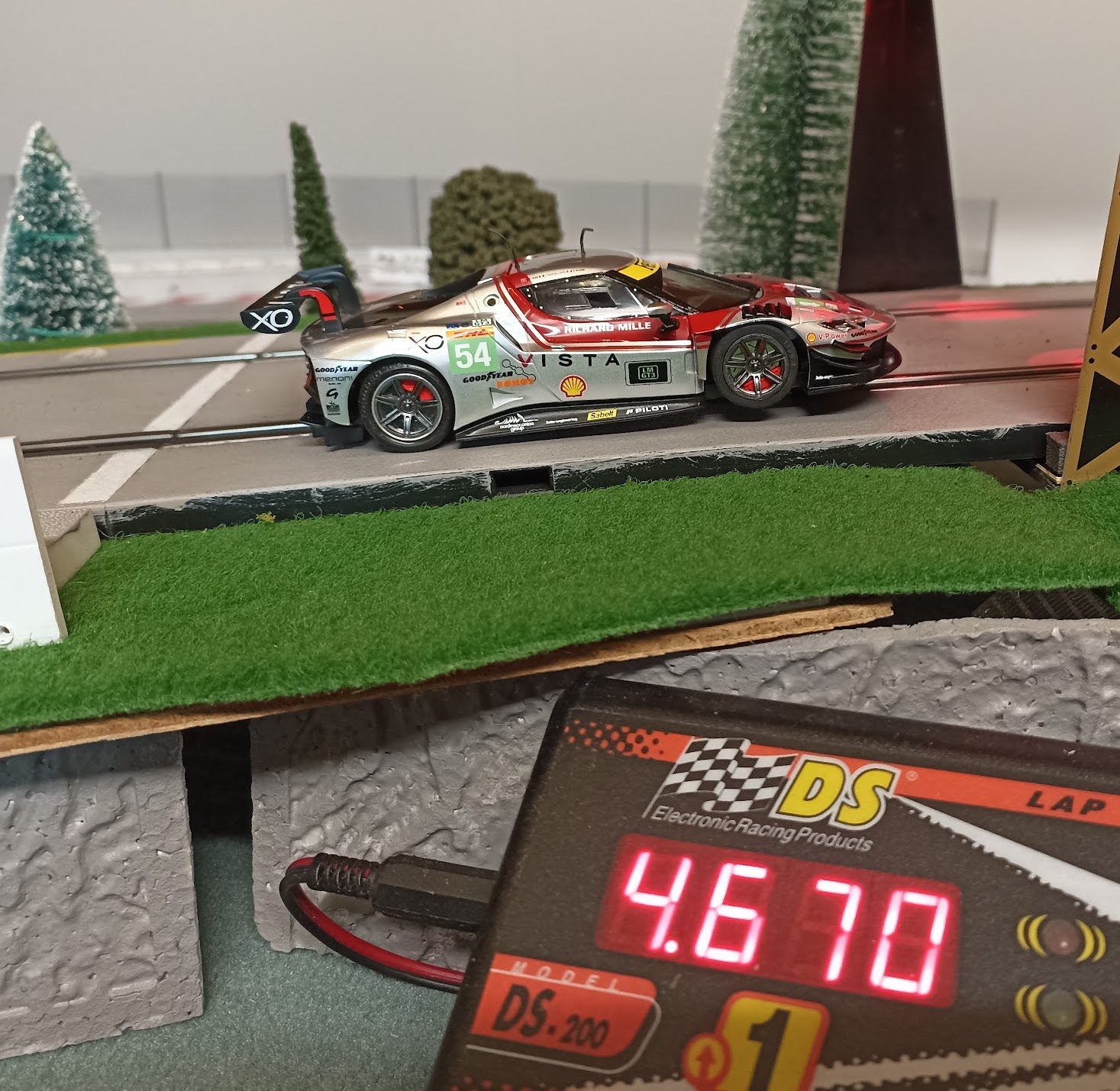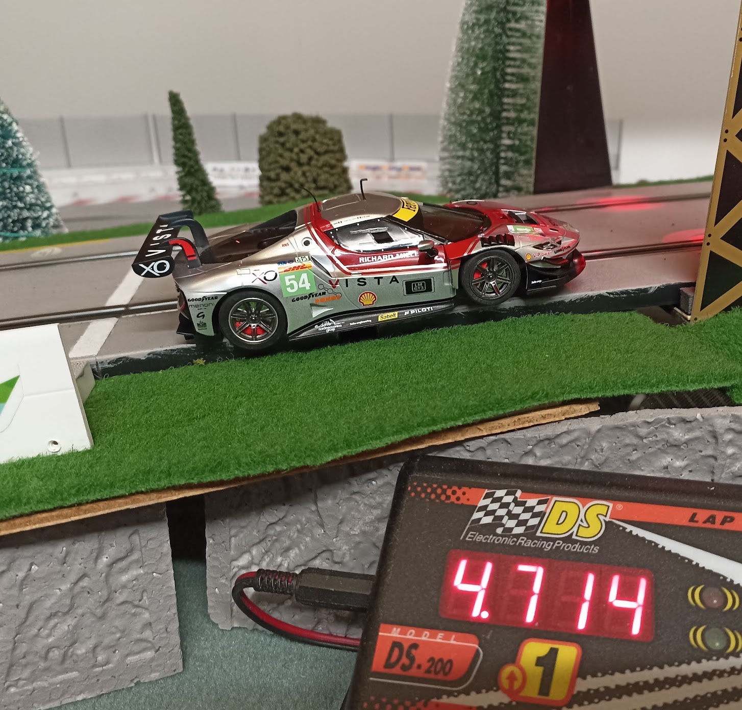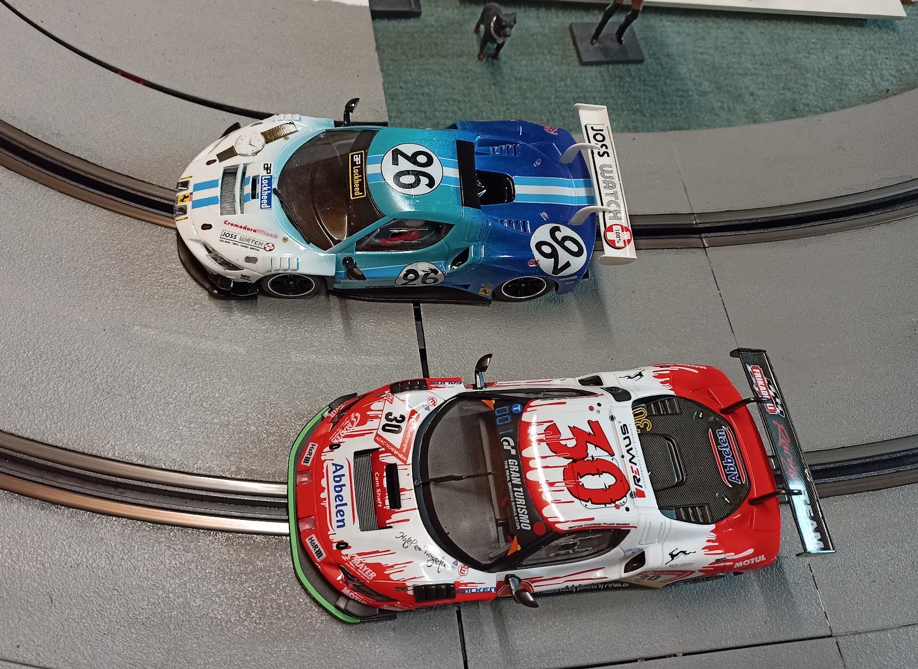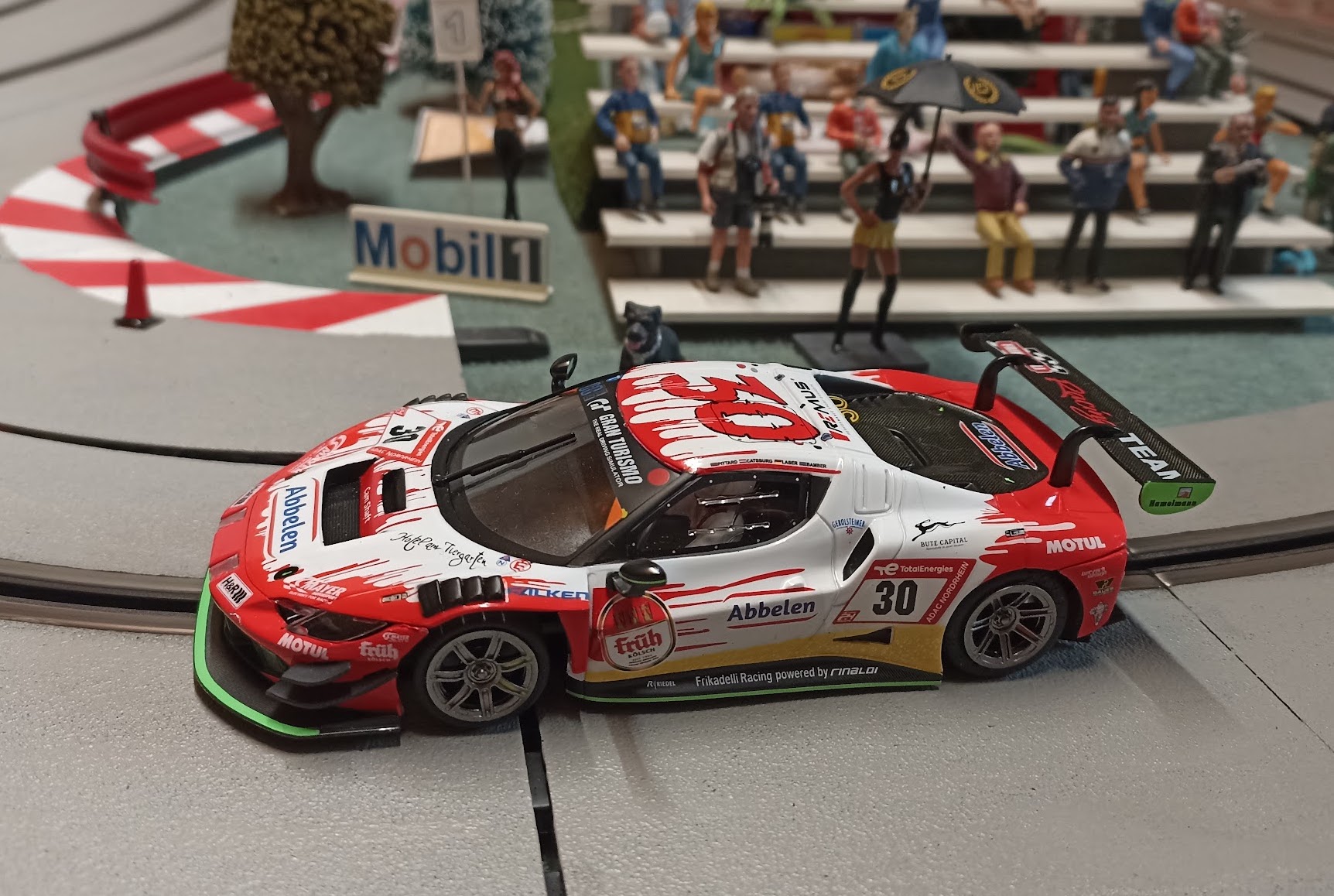 J’ai d’abord acheté ce modèle gris qui était moins commun que les versions rouge et jaune de Spa. Il est superbe mais j’avais oublié que ma piste est peinte en grise et que du coup les voitures grises sont moins visibles … je suis un peu con mais je me soigne et du coup j’ai peint la piste en noir … non je rigole, du coup j’ai aussi acheté plus tard une version rouge et jaune 😄