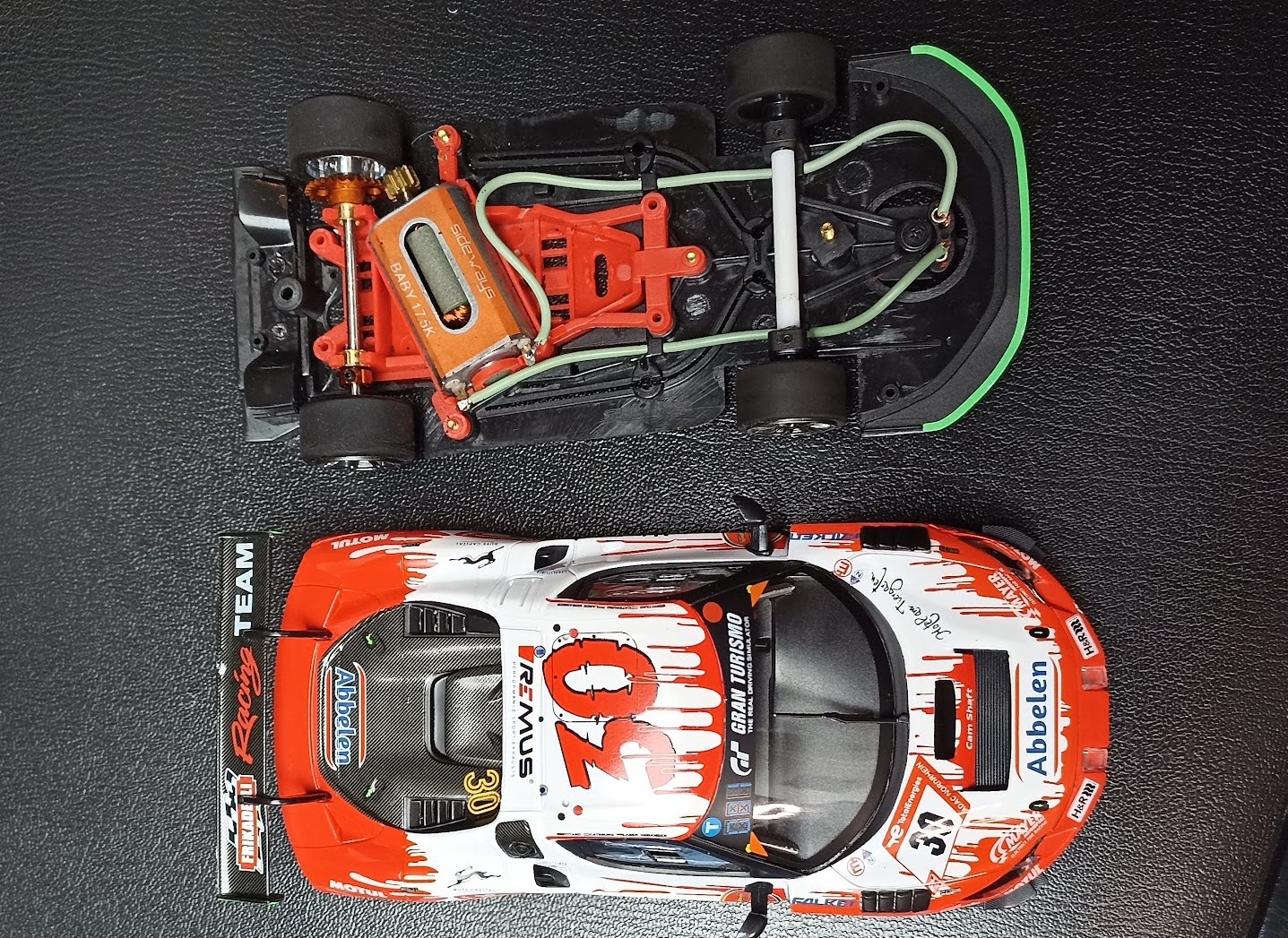 Le châssis est assez basique (pas de inflex), le support moteur en angle est suspendu en 6 points (moi qui n’aime pas les suspensions …), le moteur est un 21.000 tours très peu magnétique, pignon et couronne sont corrects mais moins bien que du NSR ou Sideways.