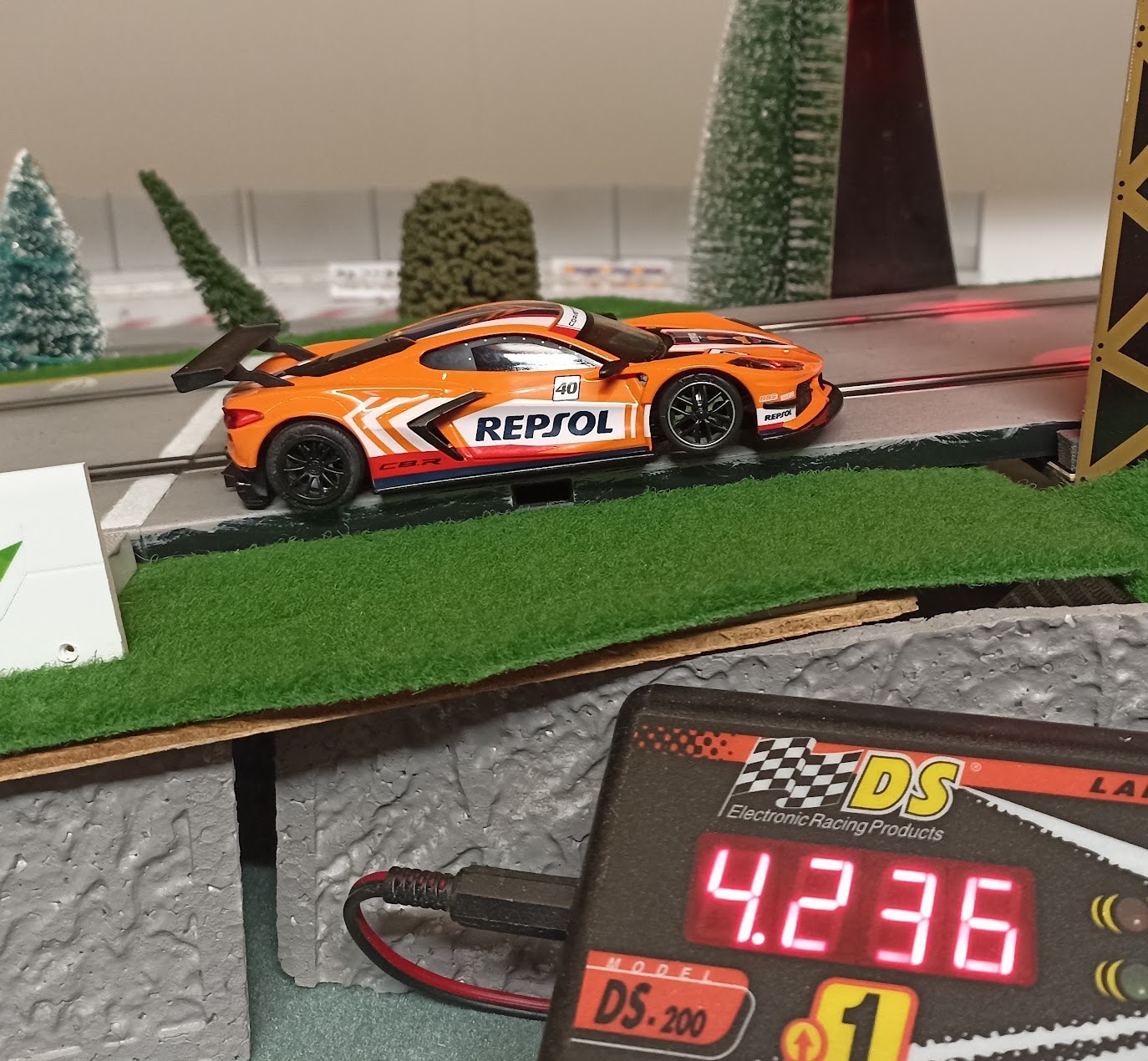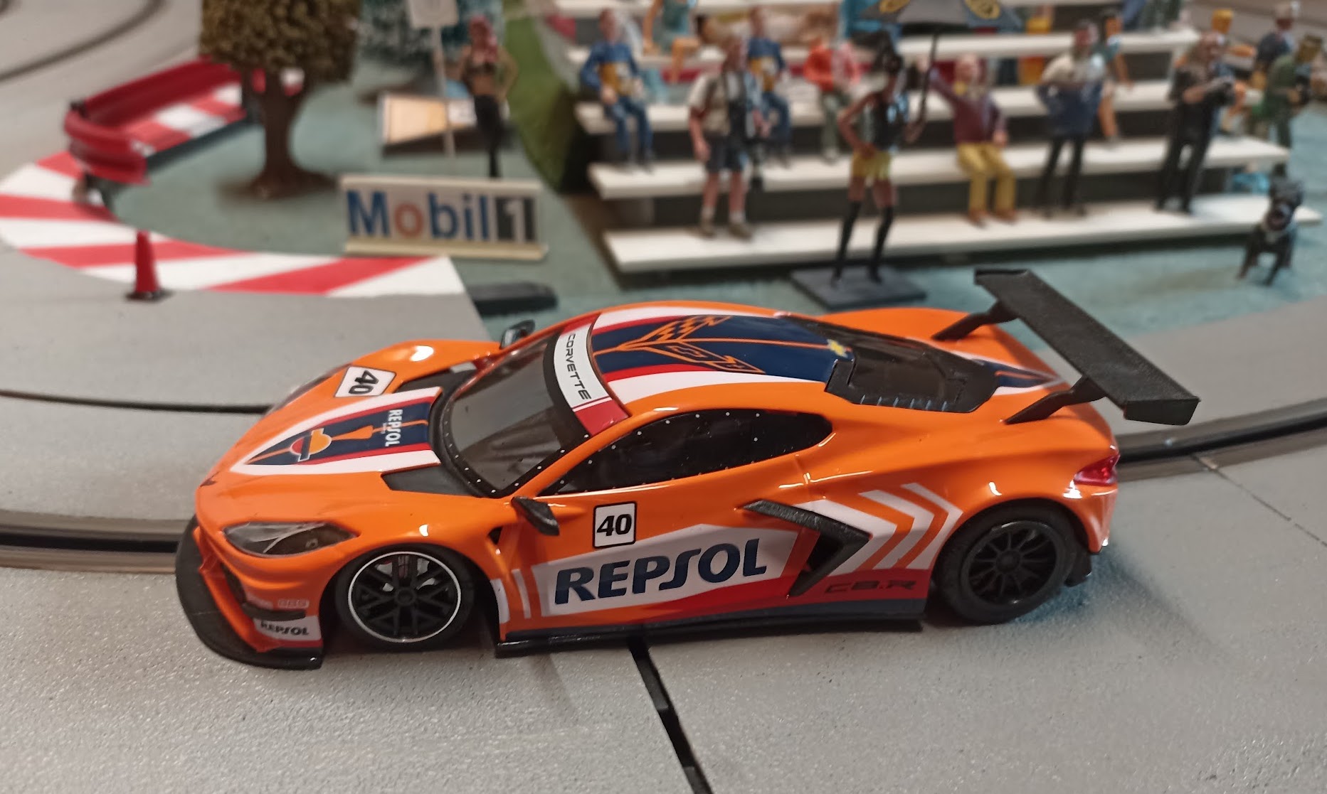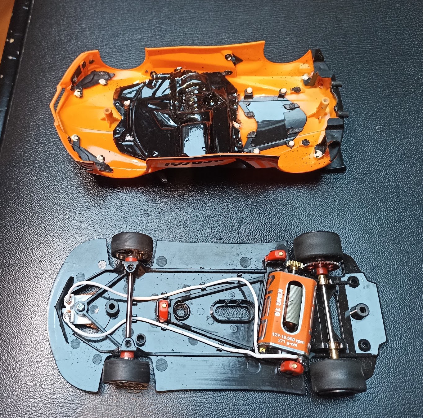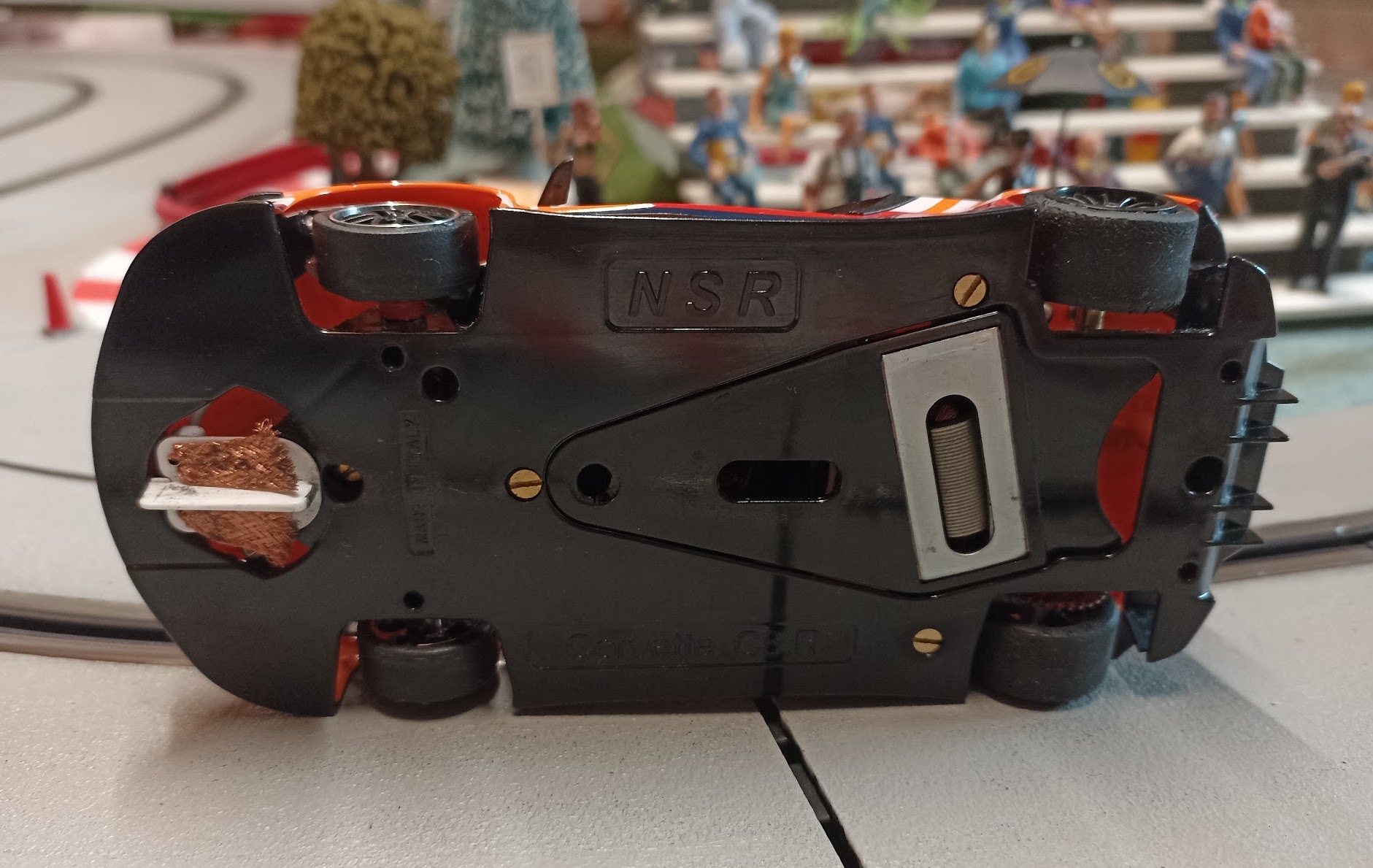 Sur cette photo on voit que j’ai aussi changé les roues/pneus arrières, j’y ai mis des pneus collés/tournés de chez NSR ref. 9011, ça marche extrêmement bien sur ma piste.